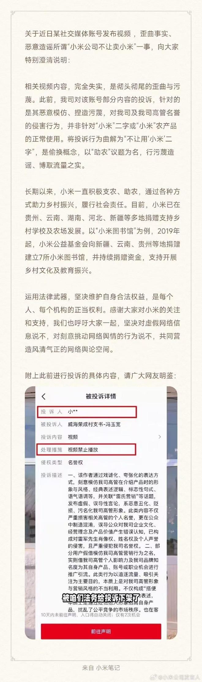 12月12日下午,@小米公司发言人就山东省威海市荣成市某村党支书“不准小米公司销售小米”的言论发表声明。关于近期某社交媒体账号发布的视频,歪曲事实,恶意散布所谓“小米公司不准卖小米”的谣言。我想特别澄清的是,有关视频内容完全不实,完全是歪曲和诽谤。以往我公司对该账号部分内容的投诉都是针对恶意模仿、捏造诽谤、侵犯我公司及我司高管声誉的行为。并非针对“小米”一词或“小米”农产品的正常使用。将投诉理解为“不允许使用‘小米’一词”的错误,是偷偷转变观念,以“帮助小米”为题。长期以来,小米积极扶持帮助农民,通过多种方式助力乡村振兴,履行社会责任。目前,小米已向贵州、云南、湖南、河北、新疆等地区捐款支持农村学校和农场发展。以“小米图书馆”为例,2019年以来,小米慈善基金会已在新疆、云南、并持续提供资金支持乡村文化教育振兴。用法律武器确保自己的合法权益得到保障,是每个人、每个机构的正当权利。我们也呼吁大家坚决对网络错误信息说不,对刻意左右网络舆论的行为说不,共同营造一个良好的社会环境。干净正直的网络舆论空间。该发言人向山东省威海市荣成市一村村支书发表声明称,“小米公司不允许销售小米”。当天下午,冯玉宽也发布了道歉视频,称“近期为了促进农产品销售,发布了一段涉及小米公司的争议视频,对小米公司造成了影响,占用、浪费了社会资源,我今后一定会在网上规范自己的言行,特此向大家表示诚挚的歉意。”此前,潇湘晨报曾报道:近日,山东省威海市荣成市滕家镇西楚家村村支书在网上销售杂粮小米,小米公司法务部以违规为由投诉删除视频。相关报道中,该村党委书记冯玉宽塔里称,自己是在卖小米这种农产品,并“呼吁小米公司给人们一条活路”。视频响起,网友们意见不一。有网友评论称,因同名被举报为村支书,让自己雪上加霜;但也有网友指出,小米公司之所以举报,是因为村书记对小米做了恶作剧。 “如果有人投诉尹阳利用小米流量就算了,投诉的理由明明是说尹阳诽谤、损害高管形象,但他却在视频中回应,称自己是因为卖‘小米’才投诉的。网友纷纷回应冯玉宽的视频。12月12日,潇湘晨报记者注意到,冯玉宽的账号已经删除了该视频并显示窗口。根据相关录屏视频,冯玉宽的账号已经删除了该视频,显示冯玉宽的账号已经删除了该视频。”宇宽用他的pred模仿小米现场行为ecessorg 发布了视频。根据举报视频的举报信息,注意到,作者投诉以开玩笑、夸张的表达方式,刻意模仿我公司高管在介绍产品时的形象和风格、经典表达逻辑、标志性句型、语气语调等,并在“射线营销”等相关话题上发布虚假误导性言论,对我公司形象进行恶意丑化、贬低和污蔑。此类内容不仅严重损害了相关高管的个人声誉,而且造成公众混乱,误导公众对我们的企业文化、经营理念和产品价值产生误解。这构成了对雷军先生肖像权、姓名权和个人名誉的侵犯,严重侵犯了我公司的名誉权。 2、部分用户在我们高管的营销行为监督下,实际使用我们的高管的个人影响力和对我们品牌的认知度来推广自己的产品、账户或职业机会……图为视频投诉的细节。 12月12日,潇湘晨报记者向冯玉宽的账号发送私信并拨打其电话,但对方未接听或接听电话。记者拨打腾嘉政府电话,无人接听。记者也联系了小米客服。该工作人员表示,以官方渠道发布的信息为准。同时,记者提问将被登记,评论将由专家进行解答。截至发稿,记者尚未收到回复。据大丰新闻报道,滕家镇政府工作人员表示,他们关注此事,冯玉宽其实是他们辖区的村支书。 “对于网上流传的信息,我们正在核实,无法做出回应。”具体情况待调查清楚。”该工作人员强调,“小米确实是当地的粮食产品,但冯玉宽销售的小米是否是本地生产的,需要调查才能得出结论。”他们将根据调查结果决定是否举报此事。知名律师河南泽金律师事务所主任傅健认为,冯玉宽的账号模仿小米销售谷物小米的营销方式,意图在营销中使用这种方式来获取流量。但如果其在视频中模仿雷军、小米的营销方式,故意或恶意嘲讽,导致小米的社会评价大幅降低,则构成对雷军、小米公司的名誉权、姓名权、姓名权的侵犯,可能要承担相关法律责任。晨报记者 吴华康 曾永红