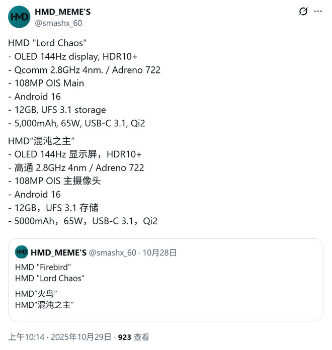 IT之家10月30日报道 消息人士@smashx_60昨日(10月29日)在X平台发推,宣布HMD正在开发一款代号“Lord Chaos”的中高端智能手机,采用高通骁龙7 Gen 4芯片,支持Qi2无线充电。性能方面,IT之家援引笔记本评测报道称,“混沌之王”将搭载高通骁龙7 Gen 4处理器。该处理器采用4nm工艺制造,CPU主频为2.8GHz,GPU为Adreno 722。该手机配备 12GB RAM 和 UFS 3.1 闪存。屏幕方面,该机配备了一块OLED屏幕,刷新率高达144Hz,并支持HDR10+,规格与HMD天际线类似。该图显示了 HMD Skyline 的图像。该机后置108像素主摄像头。电池方面,该机电池容量为5000mAh,支持65W有线快充。这是最快的迄今为止 HMD 品牌设备中的充电模式(之前为 33W)。它还将支持新一代Qi2无线充电标准,并配备传输速度更快的USB 3.1 Type-C接口。