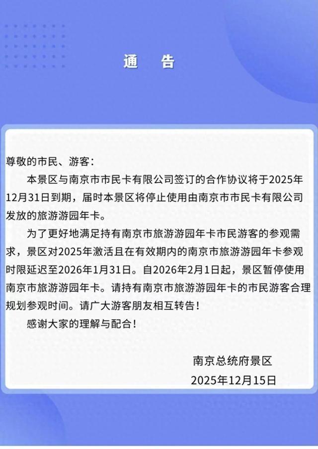 江苏省南京市的卢先生最近遇到了一件烦人的事。今年11月10日,他花260元购买了南京市民卡有限公司发行的旅游景点年卡,并于当天激活。该卡仅限持卡人使用,自激活之日起一年内可无限次游览明孝陵、灵谷寺、总统府、红山森林动物园等50多个景点。陆先生表示,该卡在南京市民中很受欢迎,申请者较多。他申请这张卡是因为他想利用空闲时间去参观总统府、红山森林动物园等城市里美丽的地方。图为南京总统府景区发布的通知。然而,12月15日,南京总统府景区突然发布公告称,双方签署合作协议南京市民卡有限公司的年卡已于12月31日到期,届时该公司发行的旅游公园年卡将停止使用。对于2025年激活且在有效期内的年卡,游览时限将延长至2026年1月31日。2026年2月1日起,度假村将暂停使用年卡。先生觉得不无道理。鲁。他买卡时并没有收到总统府景区将于2026年年卡名单中删除的提醒。他的年卡是11月份才激活的,按照原来的规定,2026年11月10日之前可以无限次乘坐。不过,新的变化之下,原本12个月的有效期被“缩短”到了两个多月。他认为,这严重损害了消费者的权益。 2025年1月8日,“南京园年卡”中的图片被微信公众号转发。 12月22日,重新华商报大风报搬运工联系了南京市民卡有限公司,工作人员表示,该公司与总统府景区的合同已于12月31日到期,目前正在与景区协商,看看如何保障年卡用户的权益。当记者询问谈判进展时,工作人员表示目前还没有官方通知,无法回应。后续如有通知,将第一时间在公众号发布。记者询问为何未告知持卡人合同将于年底到期。他说他非常抱歉。图为南京总统府景区(网图)22日下午,记者拨打南京总统府景区门票咨询025-84578888和服务热线025-84578888,但无人接听。律师声明:Good Place 与公民卡公司之间的协议对双方均具有约束力,但不能针对毫无戒心的消费者援引。陕西恒达律师事务所高级合伙人、知名公益律师赵良山认为,年票属于预付费服务合同,公民卡公司承诺“包含总统府,有效期一年”。在卡有效期内退出主要景点是指未按约定提供服务,导致服务成本降低,侵犯了消费者的公平交易权、知情权、获得约定服务权。卢先生于11月份领取年卡,12月15日收到通知,购卡激活过程中没有过期、取款提示,违反了消费者权益保护法第八条,侵犯了消费者知情权,不符合消费者权益保护原则。e 诚信。赵良山强调,好地方与市民卡公司签订的协议对双方均有约束力,但不能对不知情的买家进行处理。虽然推迟至2026年1月31日,但新的11月活跃用户激励仍有10个月左右的权益空缺,且未事先通知并与公民卡公司同步进行补偿计划,处置流程不合理。赵良山指出,如果年票条款中包含“景区变更不负责或者最终解释权属于当事人”等类似条款,根据《消费者权益保护法》第二十六条,该条款属于排除消费者权利、免除经营者责任的不公平条款,应认定无效。赵良山建议,卢先生先整理一下证据,比如保存卡的购买记录、卡的描述等。f 年卡权益、景点通知、客服沟通记录。随后,卢先生优先与公民卡公司协商,要求以年票为代价按照总统共享宫殿的比例退款,或者给予同级别景区替代权益;如果协商不成,他可以通过诉讼来维护自己的权利。华商报 大丰报 记者 常鹏多 编辑 李静
