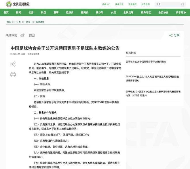 中国足球协会发布了公开宣布的公众选择和任命国家男子足球队的主教练。 9月5日,中国足球协会发布了公开选择和任命国家男子足球队主教练的消息。详细信息:努力地加强了国家队在新周期中的建设,从而有效,迅速地提高了国家队的竞争力量和水平,并创建了一个具有出色风格,良好战斗和伟大赢得该国荣耀的国家男子足球队。研究后,中国足球协会将被公开选拔,并招募国家男子足球队的主教练。相关对象称为以下内容:1。工作信息(i)工作名称美国总教练的主教练男士。 。 2。注册的条件和要求(1)占据专业教练证书和教练证书许可在适当的时间内; (3)原则上,60岁以下的国籍不限于全职运作; (4)具有强大的沟通能力; (5)保持健康,在道德方面拥有良好的个性,并在社会中拥有出色的形象; 。 。 3。注册材料,时间和程序(i)注册材料1。注册表(请参阅附件)2。专业证书教练和许可教学内的教学3。请注意,直到2025年9月20日。材料将发送到注册电子邮件地址。 4。信息部:中国技术部足球协会:010-59291097 EMA注册
