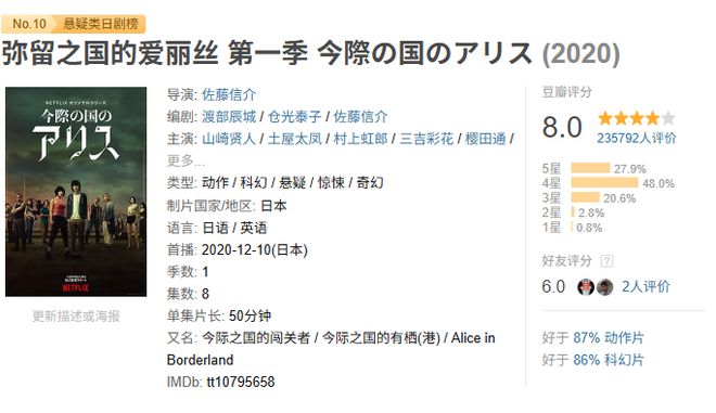 五年前,日本戏剧《死去的国家的爱丽丝》的第一季发行了。大图片,紧张而令人兴奋的情节以及触及人性黑暗面的深层含义……一旦启动,它就会打破整个网络。出乎意料的是,第二季的声誉遭受了滑铁卢的影响。它仅从douban 8.0下降到测试的通过。除了感到沮丧之外,这个结果还使许多人相信这个故事将在这里结束。但是经过三年的沉默,第三阶段实际上是发起的。这似乎是基于声誉的刺激。 Yu叔叔还屏住呼吸看着整个舞台。我可以在这个季节吗?让我们来谈谈 - “死去的国家的爱丽丝”的第三阶段已经改编自著名的狗漫画野兔。这就是押注救赎的游戏世界的故事。根据对原始作品的一般忠诚,真人电视连续剧还增加了一些原始内容。主角Yusu(由Yamazaki Kento饰演)是对游戏和逃避现实师的otaku。有一天,他和两个被社会击败的朋友无法解释为一个名为“领域北部”的世界。仅通过在这里玩游戏,您就有机会生活。这里的游戏并不像我们想象的那么有趣。游戏体系结构基于扑克牌,并根据不同的需求分为四种类型:黑桃,测试体力;正方形,测试智能;梅花,测试团队合作;和红心,测试人的心。 A-K的数量正在逐渐增加贫困。如果您获胜,您可以继续生活;如果您输了,那意味着死亡。但是不要以为您可以不玩游戏而逃脱死亡。今天,该国每个人的签证都有限。签证到期时,玩家将执行从天上掉下来的激光。仅通过游戏,您就可以获得签证延期,而扩展天数为e质量游戏数量。因此,在这个世界上,如果您想生活,应该玩。一旦发布第一个季节,各种可怕的游戏,高度的节奏和丰满的角色,结合出色的制作和视觉效果,以及正确的钩子,并获得了良好的声誉。尽管第二阶段通常是下降的,但还有一两个精美的游戏,以及角色的kahanga。它还揭示了有关“民族国家”的真相。事实证明,当今的国家是一个人在生命垂死或伤害时出现的世界。如果您在这个世界上死亡,那将意味着真理中的真实死亡。如果您生存到最后,您将有机会重返真理并再次生活。在第二个赛季结束时,Arisu和Usaki(由Tosaya Tsuya扮演)都通过了所有级别。他们选择了后者,并选择了“留下来成为永久民族”和“返回现实世界”的选择。在现实世界中醒来后,记忆在这两个比赛中,在土地上进行了比赛。但是在精神统一中,我们仍然见面,爱,成为妻子和妻子。这确实是原始漫画完整故事的结尾。因此,第三阶段通常是原始的Banetflix语言。这段时间的开始,男女对手的生活进入了稳定和幸福的道路。尽管我忘记了Imaki王国的经历,但Usaki在现实中看到同一场景时突然闪烁。流血而可怕的回忆出现了。 Arisu还与他的前合作社工作同事会面,并开始唤醒一些分散的回忆。有一天,Usaki遇到了Takaji(由He Lai Kento扮演),他是一位在死后继续研究世界的学者。他们俩都躺在毒品上,陷入了不谨慎的状态。从过去开始,我们就知道当前的国家是人们死亡时进入的世界。实际上,有人发现了这个秘密和Developed去那里。也就是说,心脏是用药tstop。这种类型的逮捕大部分只能需要两分钟,否则将完全死亡。但是,在垂死的状态下,对时间人的理解与现实不同。在短短两分钟内,您还可以在天堂进行长时间的比赛。因此,为了营救Usaki,Arisu寻求了他的前队友的帮助,他的前队友遭到了一枪的药水袭击,并回到了Imaki国家。众所周知,这个故事的最大亮点是各种死亡游戏。回到世界之地的男性主角在本赛季的第一场比赛中非常有趣。该游戏也是原始漫画中的第一场游戏:“画神彩票”。在每次限制时,请画十张圣洁的彩票。只要您解释签名是正确的,即使您安全地生活直到最后,您也将通过测试。这很简单,对吗?一位瘾君子最终听了规则,并拉了一项规则。“祝你好运”。除了签名外,别无其他。瘾君子安全地通过了第一层,然后一个女孩被绘制为“ ji”。除签名外,还有一个数学问题。如果答案不正确,则将启动正确答案数量差异的火箭。周围的环境提供了各种答案,并且由于倒计时的压迫感,女孩给出了错误的答案。一瞬间,枪击了三枚火箭,以两个人的生命结束。最初笑和笑的球员在瞬间保持沉默,零散的恐惧和刺痛。接下来,签名文本中的主题变得更加困难,包括医学,法律,哲学,心理学等。每一次扭曲都有更多的火箭。该地区立即变成了火灾。当有习惯时,您提出的问题是:世界人口的数量?他回答,79亿。答案是80亿。 ans是错误的。天空附近的一亿只火箭。目前,如果它是视觉刺激,它将立即达到极端。此外,塔高吉(Takaji)参加的“幽灵卡”游戏也令人兴奋。绘制幽灵卡,每个人都在他们小时候玩。但是这里的规则相反 - 任何持有幽灵卡的人最终都是赢家。如果绘制幽灵卡,将立即将其删除,罚款是电气高压冲击,直到死亡。这是一个取决于运气的游戏。但是可以肯定的是,由于这一点,球员的心理意义更大。尤其是当我看到我周围的人们被电死的人的悲惨境地时,我感到非常压迫。但是,内容的良好外观仅次于第二。为了完成第二季会员角色的成长,游戏节奏变得非常慢。不仅游戏的难度变得简单,而且还在添加了讲道。这已经完全从智商安全游戏变成了日本鸡汤戏剧。这仍然是对原始工作的最终影响。到第3季时,这个问题更清晰。从那时起,就没有更多的样式和颜色,他们都在玩鬼牌游戏。因此,我们永远不会知道游戏的偏见和困难。通常,所有游戏的政策都