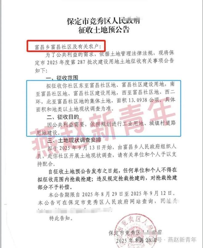 196.407 亩! Xicheng的另一个村庄即将获得土地,其目的是工业和城市道路。什么项目?这可能是Jingxiu经济发展区的土地! Pre-announcement of land release of the People's Government of Jingxiu District, Baoding City (Fuchang Community) Fuchang Community and Related Farmers: For the needs of public interests, in accordance with land management laws, the announcement of the land construction of construction lands in 2025 is the following: 1. Community to the community of Fuchang and Fuchang community in the East, to the community of the Fuchang and Fuchang community in the west, the Fuchang and West第二环路社区,北部的富昌社区,富昌社区,面积为13.09 38 Hecares。特定的土地和类型AY必须受到当前土地状况的调查。 2。支出的目的应基于工业用地和城市的规划并根据公共利益而建造农村。 3。计划的土地状况调查计划于2025年9月13日开始。FuchangTownship的政府将安排员工前往您的社区进行土地状况调查。请支持并与相关的单位和个人合作。从征收土地征用日期起,任何单位或个人都不得急于建立在拟议支出的范围内;如果匆忙制定违反法规的行为,则不应在急速建造的情况下给予任何赔偿。该公告的期限为2025年8月29日至2025年9月12日。可以在Baoding City的Jingxiu区的人民网站政府中进行检查...扩展信息:Baoding的Jingxiu经济发展区的总面积,Hebei Hebei是433.15公顷的人为433.15公顷,并分别为3街区。 1号块的面积为114.54公顷,四端范围IS:从化学纤维的东边界,向南,向南到达西南路,西部的西部层纤维工厂的西部边界,位于豪华西路以北;第2块的面积为24.49公顷,四端范围为:向东,在Xidi Road的Baoman Road向东,向西到Xidi Road,北至Houhe;第3块的面积为294.12公顷,四端范围为:向东:东向福坎路(Fuchang Road)向西,位于Dongfeng West Road以北的第二环路以西。目前,似乎会有很大的发展!西方团结一致!