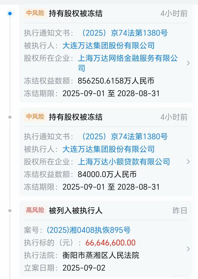 根据9月5日的新闻,Tianyan Check App显示,最近,Dalian Wanda Group Co,Ltd(从那里称为Wanda Group)向股权释放了两个新信息,并将总计的冷冻股票总数达到94亿元。其中,股权所在的上海Wanda Network Financial Services Co,Ltd冻结了85.6亿元人民币和股权所在的上海Wanda Microfinance Co,所在的上海Wanda Microfinance Co,是8.4亿元人民币。冻结期为三年,实施法院都是北京的金融法院。图片显示了Tianyancha应用程序的屏幕截图。迄今为止,万达集团共有38个股权冻结信息。此外,Wanda Group最近添加了有关执行目标的新信息,目标是实施66.646亿元人民币,而实施法院是亨奇市Zhengxiang地区的人民法院。 Tianyan Check应用显示TWanda Group拥有10份信息,以实施实施,价值为49.29亿元人民币;有关该人的25条信息,其实施价值高达912.5亿元人民币。实施总额为140.54亿元人民币。万达集团及其会员公司负责。债券报告中的主要风险警告表明,到2024年6月底,达利安·万达商业管理集团有限公司(因此从因此称为万达商业管理)负有1375.61亿元人民币的利益,其中302.69亿元的利益带来了一年的利益。短期债务的集中成熟度对万达的现金流构成了巨大挑战。面对严重的债务状况,王江(Wang Jianlin)近年来推出了大型资产销售模式。去年,万达出售了26个万达广场。今年,资产销售的速度进一步加速了。在5月6日,Taimeng(Zhuhai)管理咨询合作伙伴关系(有限合伙企业),Gaohe Fengde(Beijing)企业管理服务公司,Ltd。和其他案件批准获得48家公司的股权股票,包括北京Galaxy Enterprise Management Co.,ltak with Inter Inter Inter Inter Inter Inter Inter Inter Inter Inter Inter Inter Indir with Indir with intir in equanda in equanda of Eqeity of Eqeity equanda of Eqeity equanda equanda of 48 WANDA万达集团。根据Pengpai News的报道,交易的价值将达到500亿元人民币。这将大大减轻万达集团的流动性压力。到今年7月底,万达商业管理重新销售是万达广场。 Tianyan Check App显示,7月31日,Chuzhou Wanda Plaza Investment Co,Ltd经历了工业和商业变化,商业管理Wanda从股东撤退,并在Langfang Zeruit Technology Co.,Ltd. Ltd.未能履行有效的LE付款债务确定的Langfang Zeruit Technology Co.中增加了财产。GAL文件在实施通知书中指定的时期内,涉及建筑合同案例的案例。今年6月,Wanda商业管理由157万元人民币执行,以应对此案。迄今为止,万达商业管理总共拥有36个历史信息,其中有5.98亿元人民币的实施;和1个受到实施的人的信息,有467,400元。